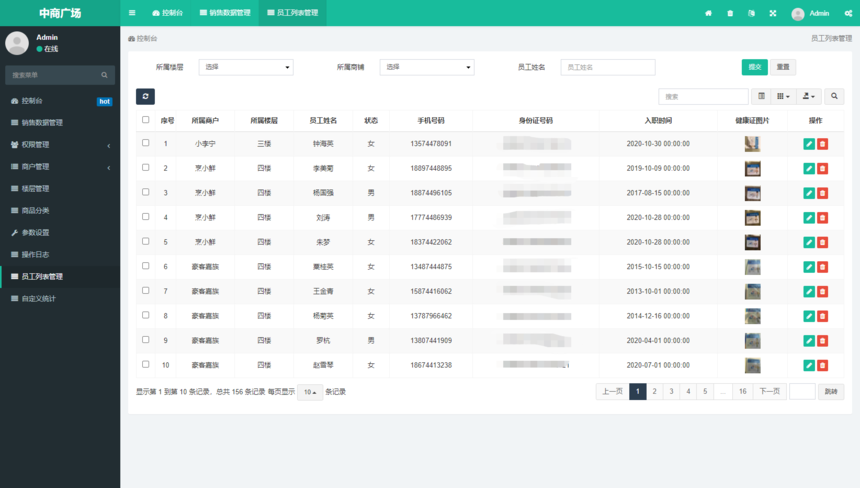 管理后台:系统管理,商户管理,销售数据管理,数据统计,工作人员管理